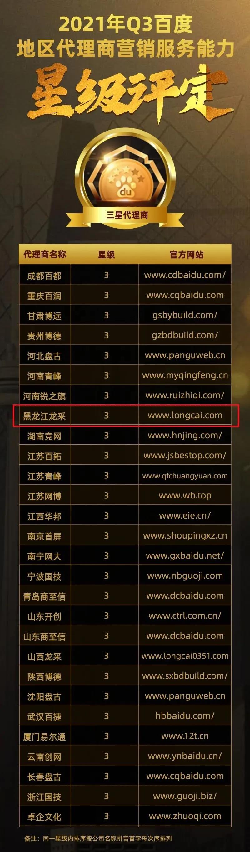 黑龍江龍采榮獲2021年Q3百度“三星”代理商稱號(hào)!