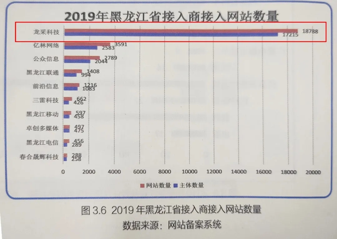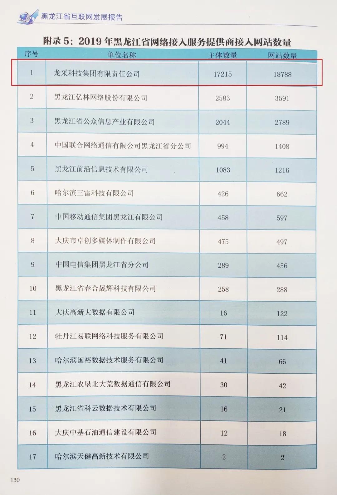2020年8月5日,由黑龍江省通信管理局、中國(guó)互聯(lián)網(wǎng)協(xié)會(huì)、黑龍江省互聯(lián)網(wǎng)協(xié)會(huì)、國(guó)家互聯(lián)網(wǎng)應(yīng)急中心黑龍江省分中心聯(lián)合編纂的《2019黑龍江省互聯(lián)網(wǎng)發(fā)展報(bào)告》發(fā)布數(shù)據(jù):2019年黑龍江省網(wǎng)站數(shù)量達(dá)4.3萬(wàn)個(gè),已備案網(wǎng)站主體3.2萬(wàn)個(gè)。值得提出的是,龍采科技集團(tuán)作為互聯(lián)網(wǎng)接入服務(wù)企業(yè),接入備案網(wǎng)站數(shù)量近20000個(gè),持續(xù)占據(jù)全省接入網(wǎng)站備案數(shù)量的近六成,并已連續(xù)多年位居首位,此次更超出了第二名接入網(wǎng)站數(shù)量的五倍有余,龍采科技集團(tuán)以實(shí)力賦能龍江企業(yè)數(shù)字化運(yùn)營(yíng)。