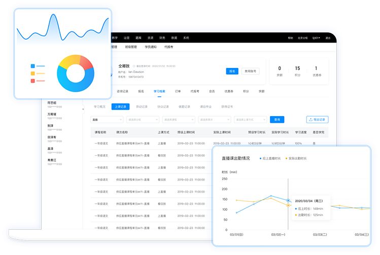 課程管理、老師管理、學員管理、上課數據管理等、精準掌控直播課堂、市場運營情況